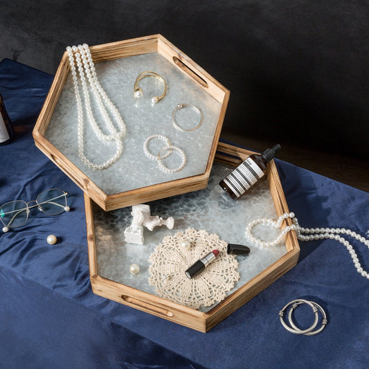 Natural Wood Hexagon Nesting Food Serving Trays Set of 2